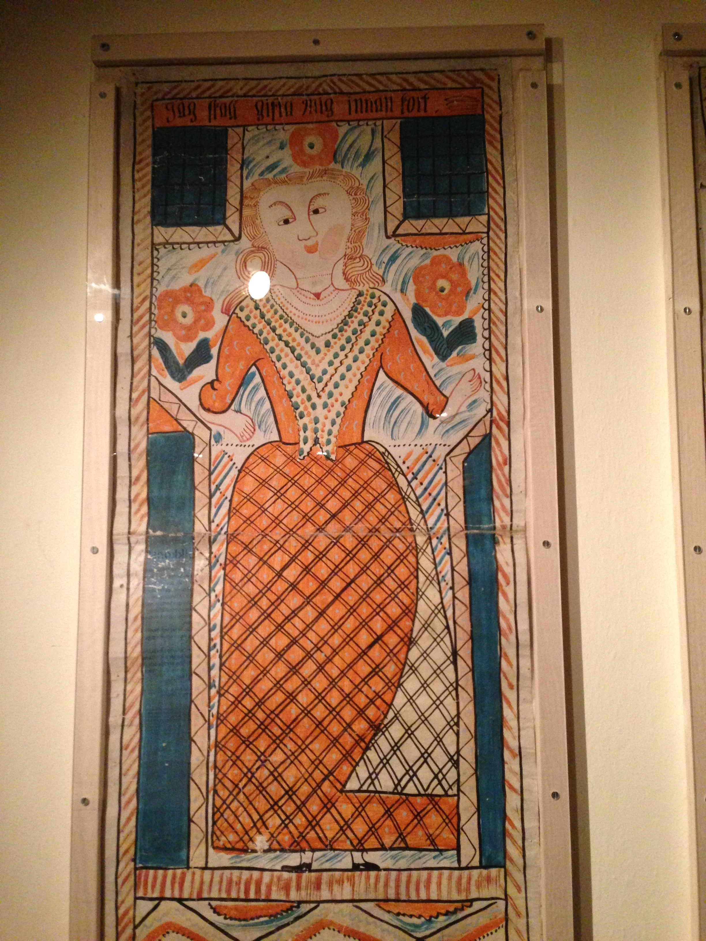 On our second day in Sweden we visited the Nordic Museum’s folk art collection. I stood in front of compositions on fabric, of kings and queens, orange and pink angels, and the baby Jesus in a polka-dotted cradle. These 19th century biblical illustrations, filled with cross-hatching, stars, dots, stripes and squiggles, were painted by self-taught Swedish peasants. Staring at them, I had an epiphany: I would copy these pretty angels. After all, I learned how to draw as a kid by copying the simple lines in my Archie comic books.