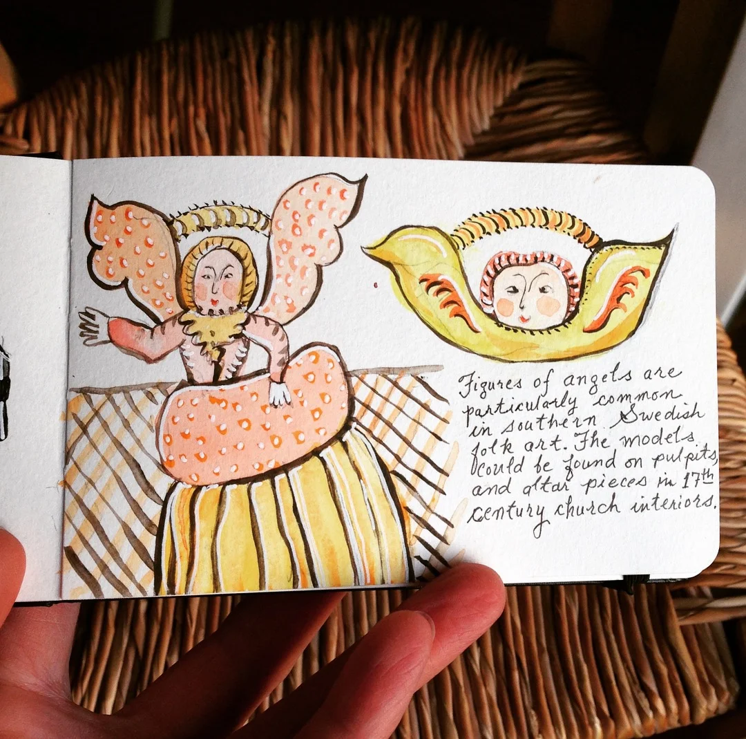 It was easy to make a loose pencil sketch of the angels, so rustically drawn it is hard to go wrong. I snapped a photo for color reference, and spent a happy hour finishing it up that evening in our little studio, thinking of peasants doing the same, once upon a time, in the southernmost part of Sweden